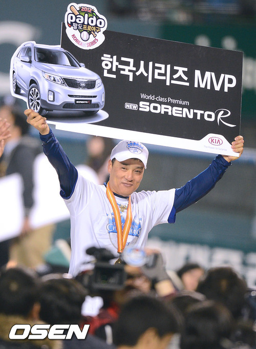 우승 후 한국시리즈 MVP로 선정된 이승엽이 판넬을 들고 포즈를 취하고 있다./ soul1014@osen.co.kr