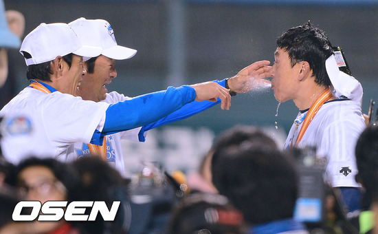 우승 후 한국시리즈 MVP로 선정된 이승엽이 코치들에게 샴페인을 뿌리고 있다./ soul1014@osen.co.kr