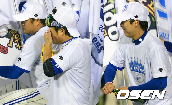 삼성 박석민이 샴페인 세리머니를 마치고 눈을 닦고 있다./jpnews@osen.co.kr