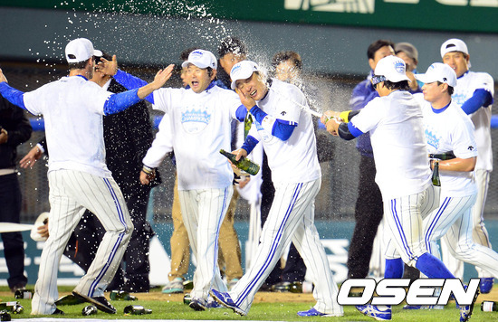 경기 종료 후 삼성 선수드이 샴페인 세리머니를 하고 있다. / baik@osen.co.kr