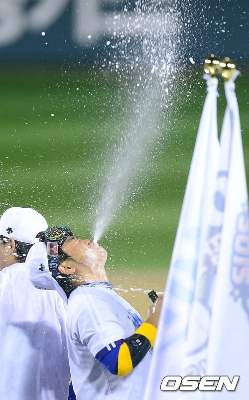박석민이 샴페인을 입으로 내뿜으며 우승 기쁨을 만끽하고 있다. / ajyoung@osen.co.kr