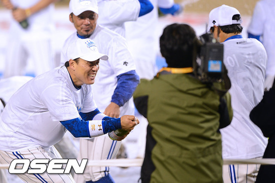 우승 후 삼성 이승엽이 이지영에게 샴페인을 뿌리고 있다./ soul1014@osen.co.kr
