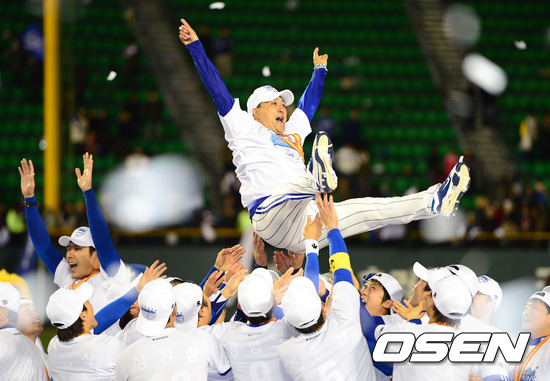 삼성 오치아이 코치가 헹가래를 받으며 즐거워하고 있다./sunday@osen.co.kr