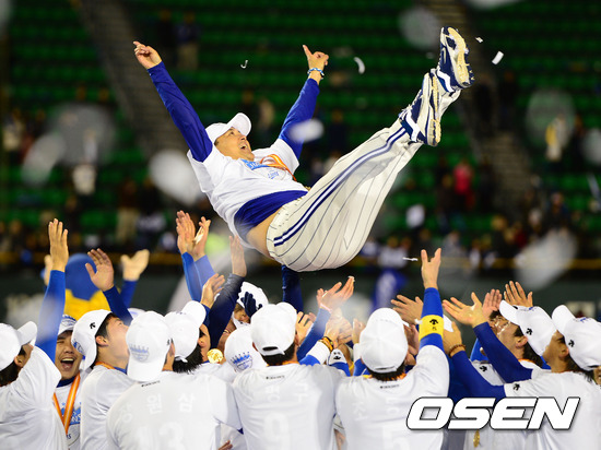 삼성 오치아이 코치가 헹가래를 받으며 즐거워하고 있다./sunday@osen.co.kr