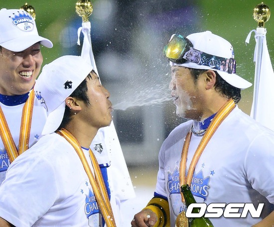 시상식을 마친 배영수, 박석민이 승리의 기쁨을 만끽하고 있다. / ajyoung@osen.co.kr