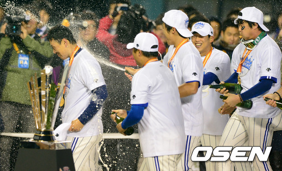 MVP를 수상한 삼성 이승엽이 동료선수들의 샴페인 세례를 받고 있다./jpnews@osen.co.kr