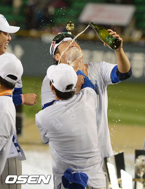 경기를 마치고 삼성 박석민이 샴페인을 입으로 뿌리고 있다. / rumi@osen.co.kr
