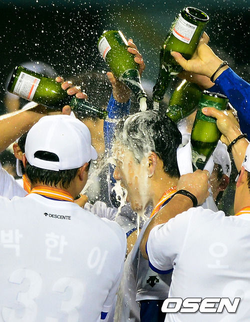 MVP를 수상한 삼성 이승엽이 동료선수들의 샴페인 세례를 받고 있다./jpnews@osen.co.kr