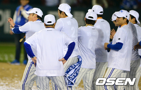 삼성 선수들이 싸이의 말춤을 추며 우승을 기뻐하고 있다./jpnews@osen.co.kr