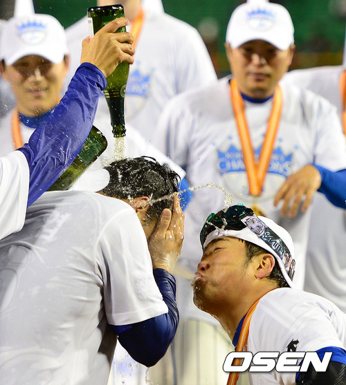 삼성 박석민이 시상식에서 MVP를 수상한 삼성 이승엽에게 샴페인을 뿌리고 있다./sunday@osen.co.kr