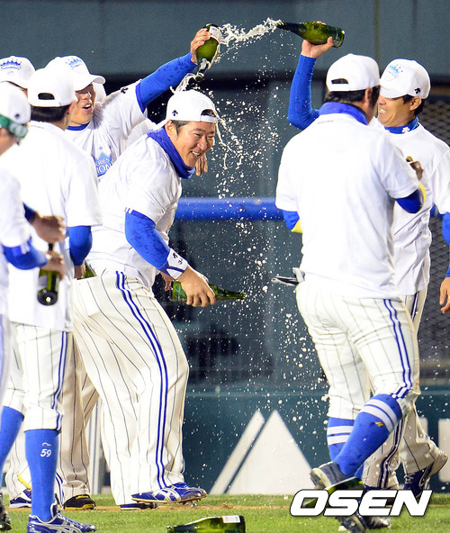경기 종료 후 최형우가 샴페인 세례를 받고 있다. / baik@osen.co.kr