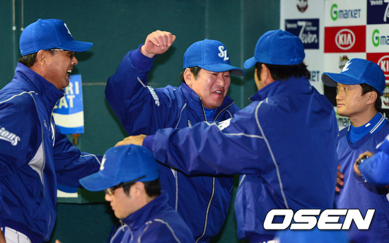 삼성 류중일 감독이 우승을 확정되자 코치진과 환호하고 있다./sunday@osen.co.kr
