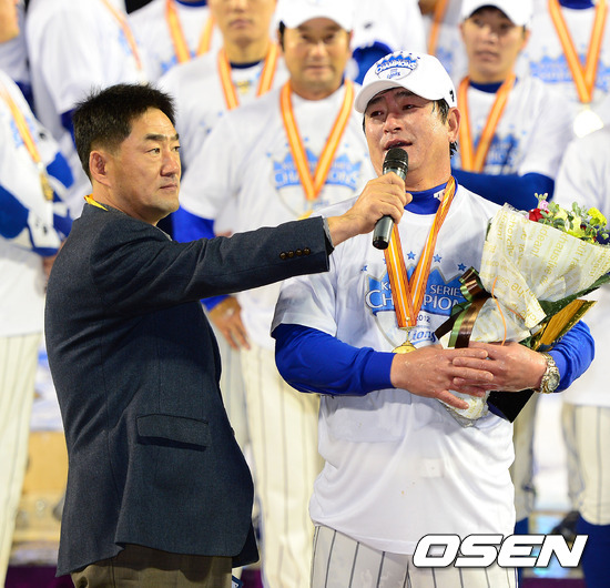 삼성 류중일 감독이 최우수 감독상 수상 후 인터뷰를 하고 있다./sunday@osen.co.kr