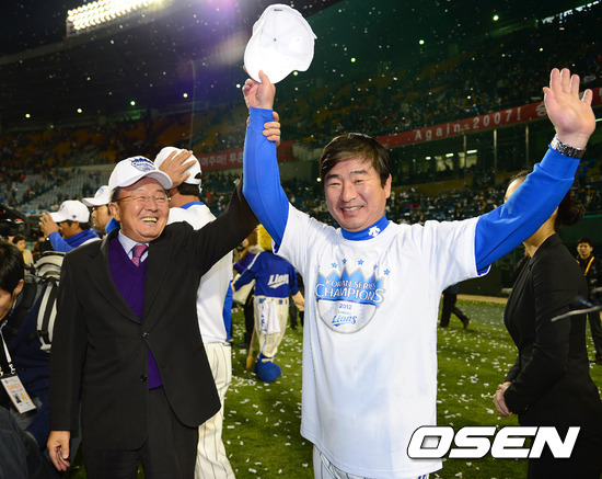 삼성 류중일 감독이 이수빈 구단주와 우승 세리머니를 펼치고 있다./sunday@osen.co.kr