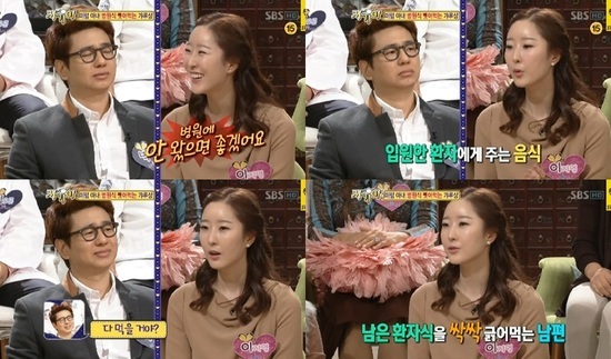 더불어 "밤에도 잠을 자는데 갑자기 숨이 막히는 것 같은 느낌이 들어 깨보니 남편이 보호자 침대가 아닌 환자 침대로 올라와 편하게 자고 있더라. 때문에 나는 불편하게 잠을 자야했다"고 덧붙여 박성호를 당황케 했다.