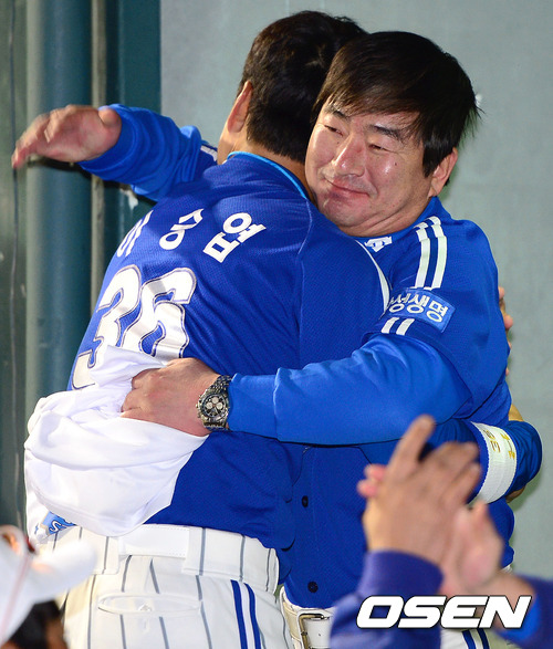 우승을 확정지은 삼성 류중일 감독이 이승엽과 포옹을 하고 있다./sunday@osen.co.kr
