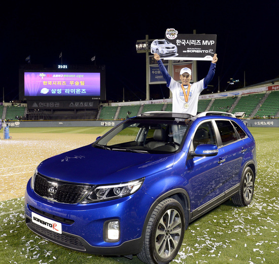 [OSEN=정자랑 인턴기자] 기아자동차가 지난 1일 잠실야구장에서 열린 한국시리즈에서 MVP로 선정된 이승엽 선수(삼성 라이온즈)에게 ‘뉴 쏘렌토R’을 증정했다.