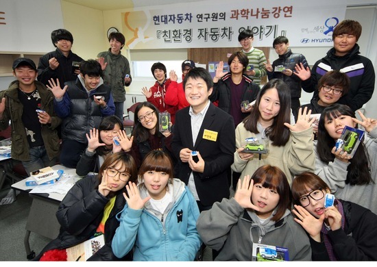 지난 1일 진행된 ‘과학나눔 강연’에서는 이진우 현대차 연구원이 두레자연고 학생 20여 명을 대상으로 ‘친환경차의 종류와 원리’에 대해 설명했다. 그리고 소금물로 가는 모형 자동차 실습과 ‘자동차와 나’를 주제로 학생들이 미래의 꿈을 상상해보는 순서도 마련됐다.
