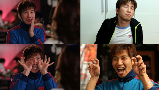 사진 속에서 극중 백수 남편 역할을 맡은 유세윤은 파란색 트레이닝복을 입은 채 손가락과 눈동자를 적극 활용하여 특유의 엽기적인 표정을 짓고 있다.