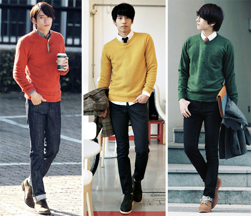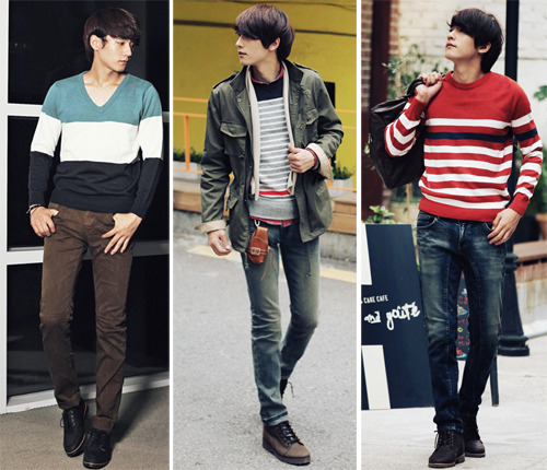 상체가 외소해서 콤플렉스였던 이들은 스트라이프 간격이 넓고 컬러베리에이션도 2가지 이상으로 된 니트를 선택하면 외소 함을 커버할 수 있다.