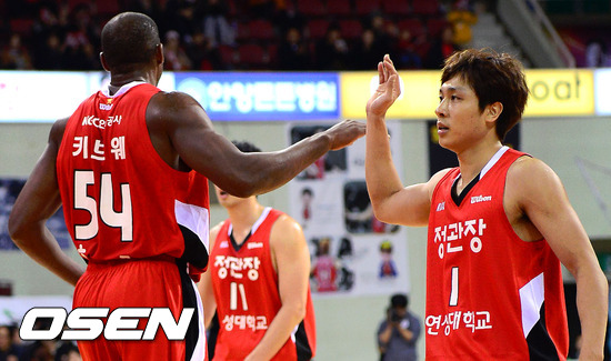2일 오후 안양실내체육관에서 열린 'KB 국민카드 2012-2013 프로농구' 안양 KGC와 울산 모비스의 경기, 1쿼터 KGC 키브웨가 득점을 올린뒤 김태술과 하이파이브를 하고 있다.