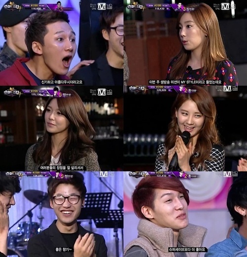 소녀시대의 멤버 태연, 수영, 서현은 2일 오후 방송된 ‘슈퍼스타K 4’에서 미션 발표를 위해 TOP6 유승우, 딕펑스, 정준영, 홍대광, 로이킴, 김정환과 만났다.