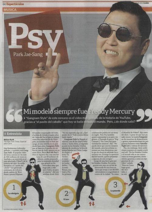 사진 속에는 아르헨티나의 언론사 클라린의 한 면이 담겼다. 신문 속에는 활짝 웃고 있는 싸이의 사진과 함께 '강남스타일'의 말춤을 추는 방법을 상세하게 소개해 놓았다.