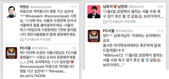 서울의 한 팬은 "시장님, 11/4에 하는 서울과 수원전에 오셔서 서울에게 힘을 불어넣어 주세요~ 서울이 리그 1위팀인데 수원한테만 7연패 중이랍니다. 천만 서울팬들과 함께 응원해 주세요!"라고 멘션을 남겼다. 이에 박원순 서울시장은 "마음으로 격려합니다. 정말 가고 싶은데^^"라고 답변을 보내며 서울 구단을 응원 했다.