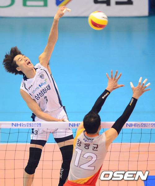 3일 오후 대전 충무체육관에서 열린 '2012-2013 NH농협 V-리그' 남자부 삼성화재와 KEPCO의 개막전 경기 1세트 박철우가 공격을 시도하고 있다.
