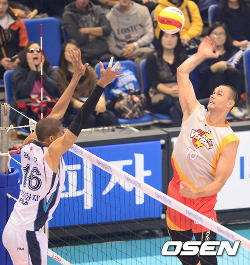 3일 오후 대전 충무체육관에서 열린 '2012-2013 NH농협 V-리그' 남자부 삼성화재와 KEPCO의 개막전 경기 1세트 안젤코가 레오를 상대로 스파이크를 시도하고 있다.