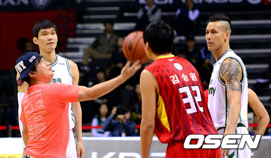 3일 오후 고양 실내체육관에서 열린 'KB 국민카드 2012-2013 프로농구' 고양 오리온스와 원주 동부의 경기에 앞서 개그맨 김재욱이 시투를 하고 있다.