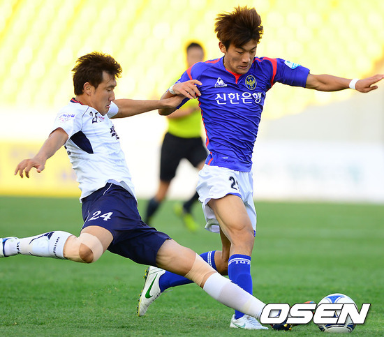 3일 오후 경기 성남 탄천종합운동장에서 열린 '현대오일뱅크 K리그 2012 성남 일화와 인천 유나이티드의 경기 후반 인천 한교원이 성남 황재원의 태클을 피해 드리블하고 있다