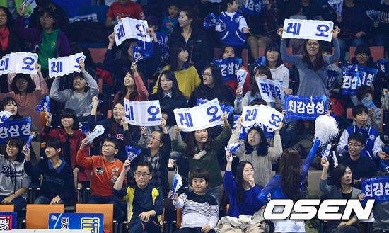 3일 오후 대전 충무체육관에서 열린 '2012-2013 NH농협 V-리그' 남자부 삼성화재와 KEPCO의 개막전 경기, 팬들이 레오를 응원하고 있다.