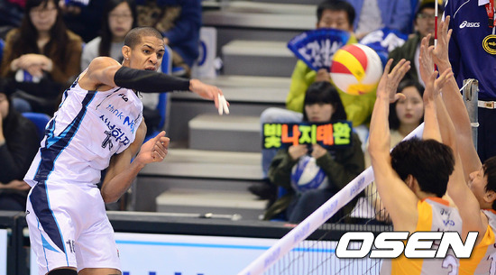 3일 오후 대전 충무체육관에서 열린 '2012-2013 NH농협 V-리그' 남자부 삼성화재와 KEPCO의 개막전 경기 3세트 레오가 공격을 시도하고 있다.