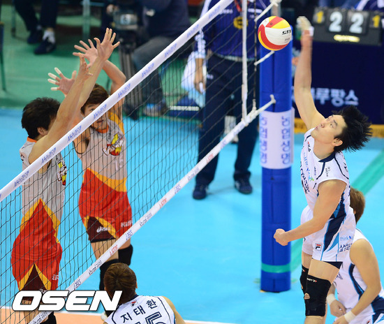 3일 오후 대전 충무체육관에서 열린 '2012-2013 NH농협 V-리그' 남자부 삼성화재와 KEPCO의 개막전 경기 3세트 석진욱이 공격을 시도하고 있다.