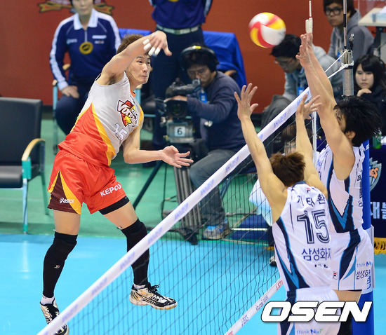 3일 오후 대전 충무체육관에서 열린 '2012-2013 NH농협 V-리그' 남자부 삼성화재와 KEPCO의 개막전 경기 3세트 김진만이 공격을 시도하고 있다.