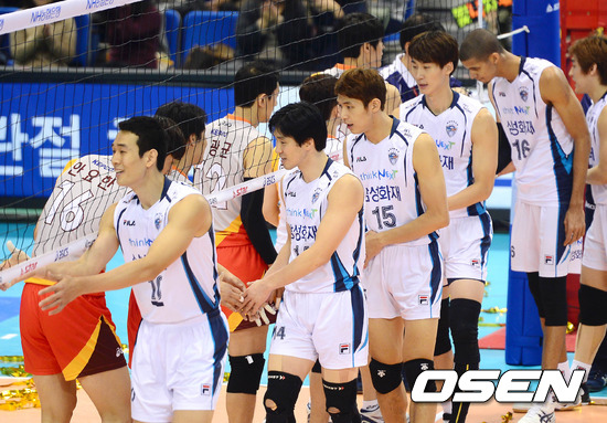 3일 오후 대전 충무체육관에서 열린 '2012-2013 NH농협 V-리그' 남자부 삼성화재와 KEPCO의 개막전 경기 종료 후 선수들이 악수를 나누고 있다.