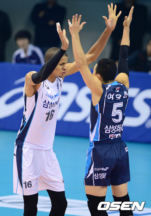 3일 오후 대전 충무체육관에서 열린 '2012-2013 NH농협 V-리그' 남자부 삼성화재와 KEPCO의 개막전 경기 4세트 레오가 여오현과 하이파이브를 하고 있다.