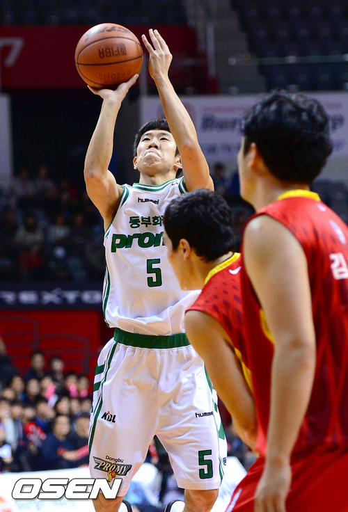 3일 오후 고양 실내체육관에서 열린 'KB 국민카드 2012-2013 프로농구' 고양 오리온스와 원주 동부의 경기 3쿼터 동부 이동건이 뱅크슛을 시도하고 있다.