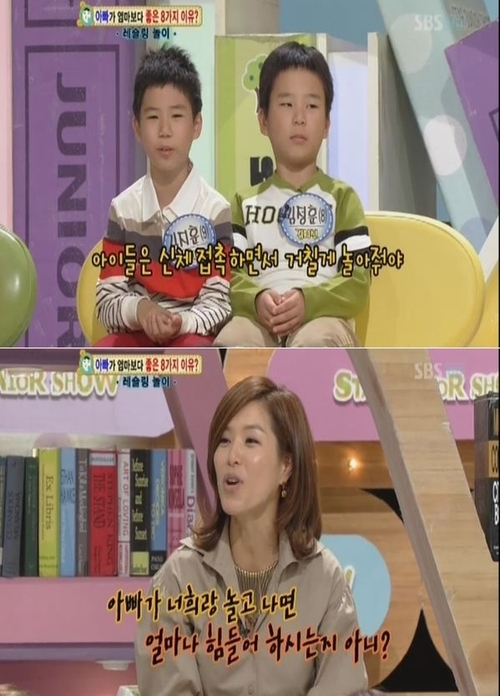 3일 방송된 SBS '스타주니어쇼 붕어빵'에서는 김지선의 두 아들 지훈-정훈 군이 출연해 시간이 없어서 잘 안 놀아주는 엄마보다 레슬링을 함께 하며 놀아주는 아빠가 더 좋다고 말했다.