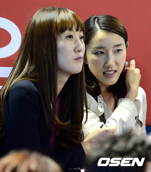 3일 오후 대전 충무체육관에서 열린 '2012-2013 NH농협 V-리그' 여자부 인삼공사와 현대건설의 개막전 경기, 한유미와 김세영이 경기를 관전하고 있다.