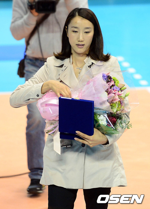 3일 오후 대전 충무체육관에서 열린 '2012-2013 NH농협 V-리그' 여자부 인삼공사와 현대건설의 개막전 경기, 은퇴식을 갖은 한유미가 꽃다발을 들고 코트를 빠져나가고 있다.