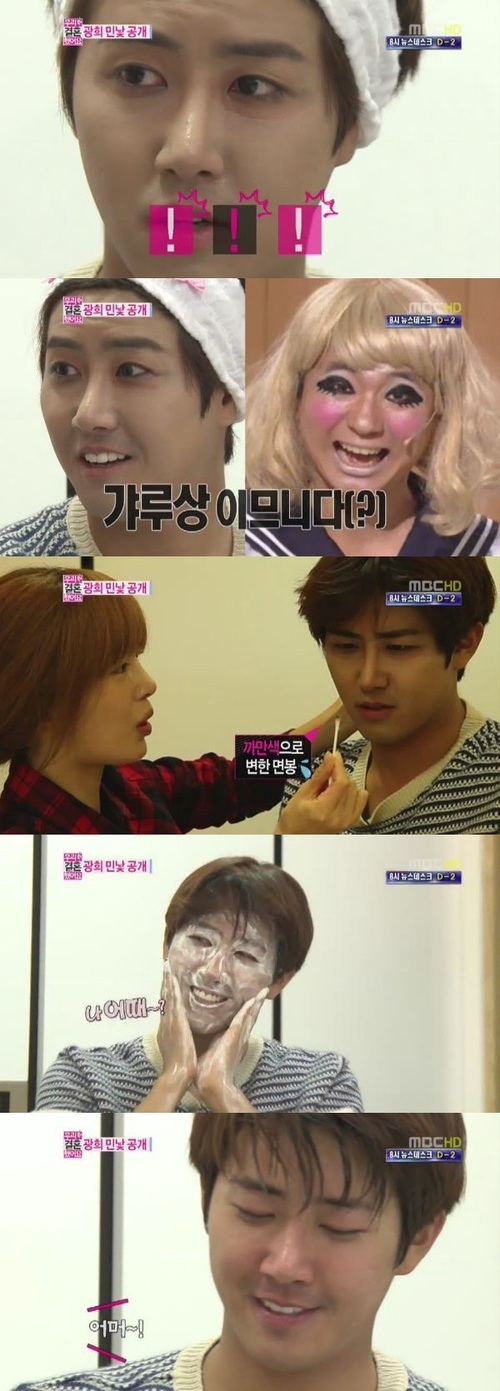 선화는 눈매만 까맣게 변한 광희의 모습에 경악하며 "베이스 진짜 두껍게 하는구나. 갸루상 같다"고 말했다. 광희는 굴하지 않고 "갸루상이무니다" 라고 받아치며 세안 내내 장난기를 발산했다.