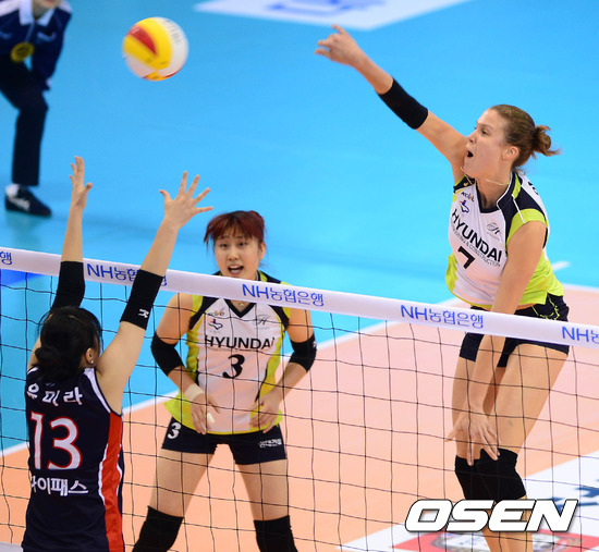 3일 오후 대전 충무체육관에서 열린 '2012-2013 NH농협 V-리그' 여자부 인삼공사와 현대건설의 개막전 경기 1세트 야나가 공격을 시도하고 있다.