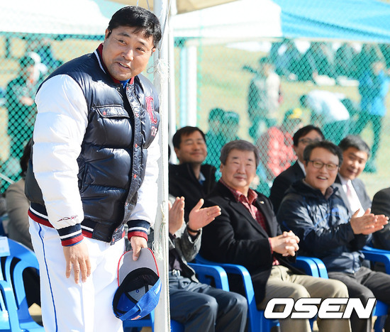 양준혁 해설위원이 소개될때 수많은 박수가 터지자 쑥스러워하고 있다.
