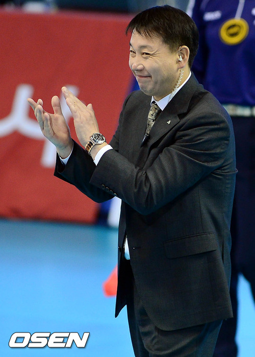 3일 오후 대전 충무체육관에서 열린 '2012-2013 NH농협 V-리그' 여자부 인삼공사와 현대건설의 개막전 경기 3세트 현대건설이 앞서가는 가운데, 황현주 감독이 미소를 지으며 선수들에게 박수를 보내고 있다.