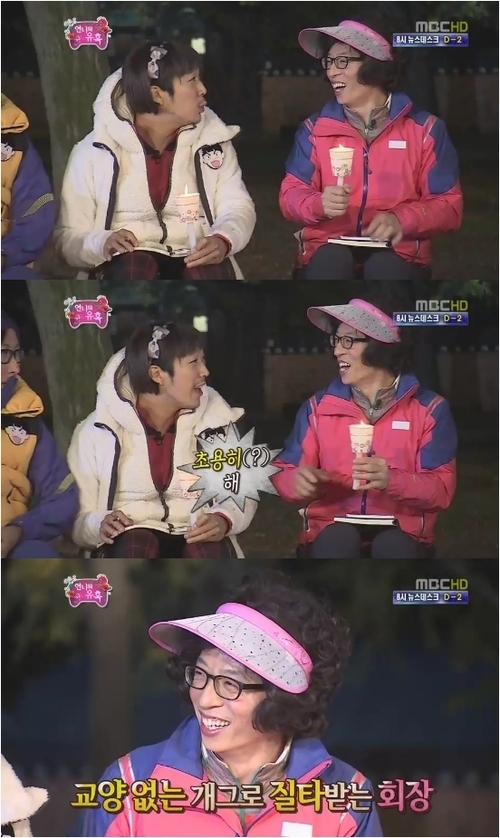 유재석의 말장난에 다른 멤버들은 정색을 했고 하하 역시 “조용히 해”라고 일갈해서 웃음을 자아냈다. 제작진 역시 “교양 없는 개그로 질타받는 회장”이라고 적었다.