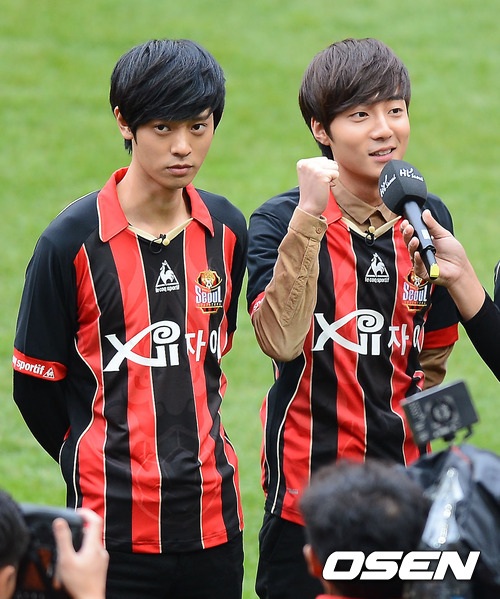4일 오후 서울월드컵경기장에서 열린 '현대오일뱅크 K리그 2012' FC 서울과 수원 삼성의 경기, 경기 전 슈퍼스타K4 정준영과 로이킴이 파이팅을 외치고 있다.