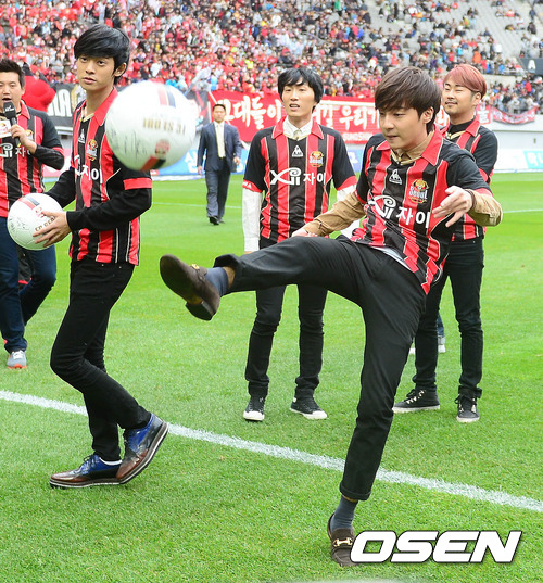 4일 오후 서울월드컵경기장에서 열린 '현대오일뱅크 K리그 2012' FC 서울과 수원 삼성의 경기 시작 전 로이킴이 사인볼을 관중석으로 차고 있다.