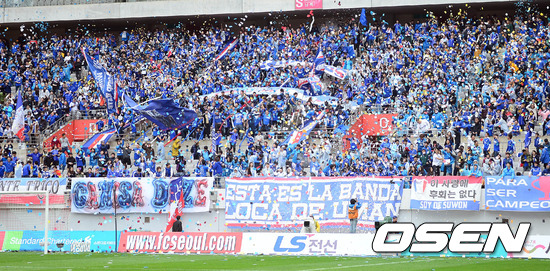 4일 오후 서울월드컵경기장에서 열린 '현대오일뱅크 K리그 2012' FC 서울과 수원 삼성의 경기 시작 전 경기장에 애국가가 나오는 가운데, 수원 팬들이 응원을 펼치고 있다.